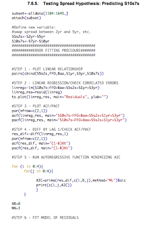 arima_pdq<-arima0(diff(S10yr),order=c(AR,0,MA), xreg=cbind(diff(FFO),diff(Baa),diff(T10yr),diff(S1yr),diff(S2yr),diff(S3yr),diff(S4yr),diff(S5yr)),include.mean=TRUE, method="ML")